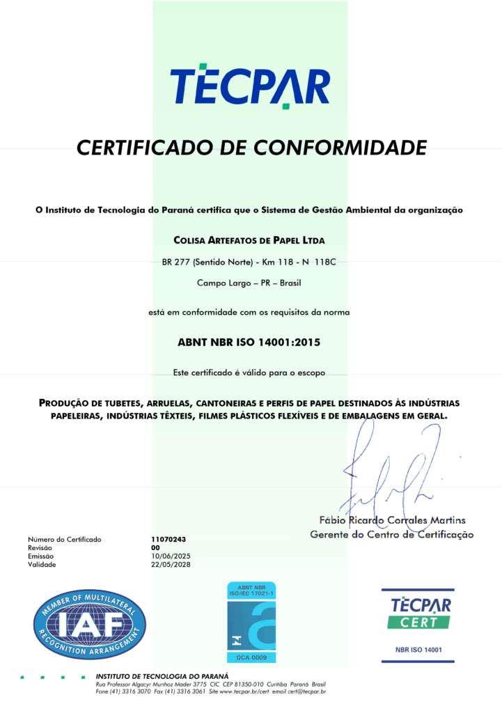 Na COLISA, nosso compromisso com a excelência ambiental é evidenciado pela nossa certificação ISO 14001. Este reconhecimento internacional atesta nosso firme comprometimento em gerenciar os impactos ambientais das nossas operações. Com a ISO 14001, asseguramos a adoção de práticas sustentáveis, desde a aquisição responsável de matéria-prima até a produção de nossos produtos, garantindo que cada passo seja guiado por rigorosos padrões ambientais.