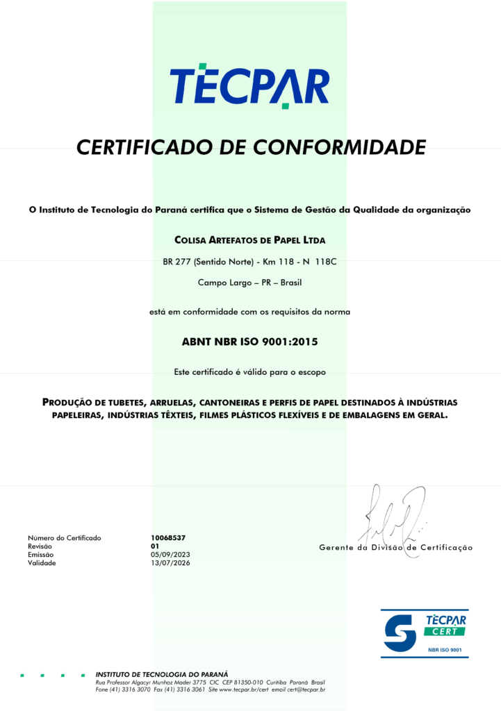 Nosso compromisso inabalável com a qualidade é a base de tudo o que fazemos na COLISA. Reforçando nossa busca incessante pela excelência, está a certificação ISO 9001. Esse reconhecimento internacional atesta nossa dedicação contínua aos mais altos padrões de gestão de qualidade. No cerne da ISO 9001 está a garantia de que cada processo, cada produto e cada interação são cuidadosamente monitorados e refinados para atender e superar as expectativas dos nossos clientes.